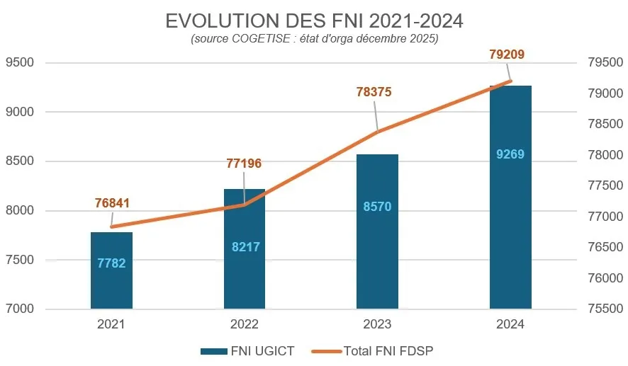 - 2024 : 9 269 affiliés UGICT –> soit 11,70% – FNI total (UGICT + O/E) = 79209